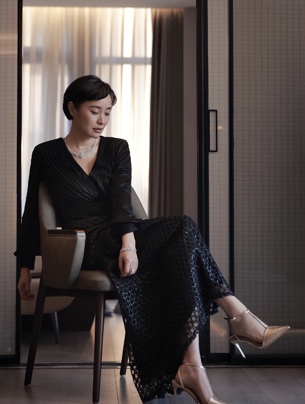 照片中的吴女士身上穿着一件黑色的长裙,上面有着镂空的设计,显得整个人十分的性感、有女人味,脚下则是踩着香槟色的高跟鞋。