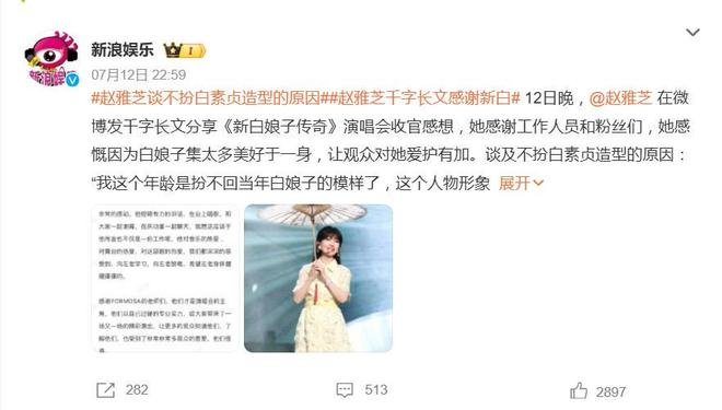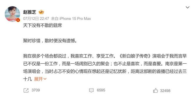 7月12日晚,赵雅芝的一篇千字长文直接冲上热搜。在《新白娘子传奇》演唱会收官之际,这位“不老女神”罕见回应了外界最关心的一个问题——为什么不再扮白素贞?