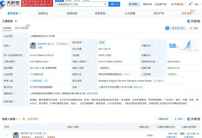 搜狐娱乐讯 据天眼查任职信息显示,迪丽热巴·迪力木拉提名下关联多家企业,其中上海镜砚影视文化工作室为其个人独资企业。该工作室成立于2017年6月,出资额100万人民币,经营范围包括影视剧、舞台剧策划与咨询等。
