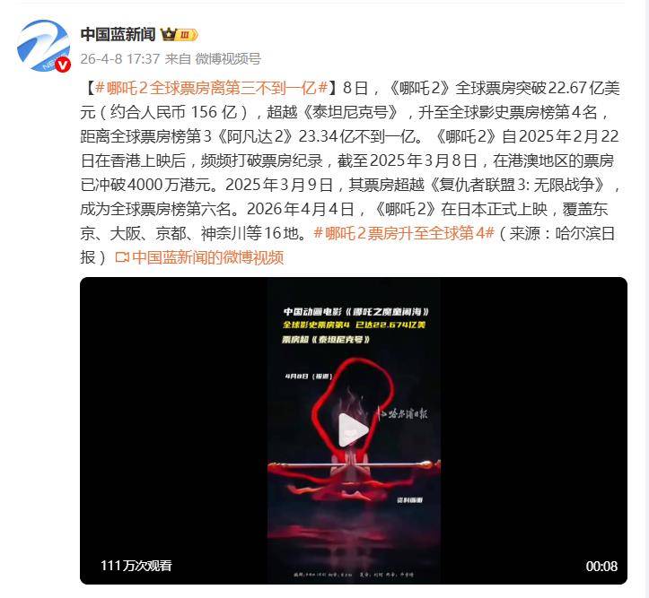 而它的征途远未止步。2026年4月4日,《哪吒2》正式登陆日本市场,在东京、大阪、京都、神奈川等16个地区同步上映,将“我命由我不由天”的热血故事带向了更广阔的舞台。正是凭借这股持续的国际影响力,影片票房一路攀升,最终在4月8日达成了超越《泰坦尼克号》的里程碑。