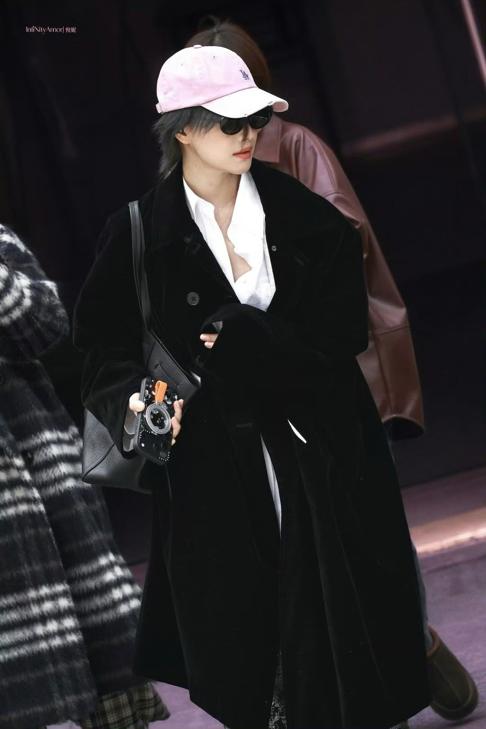 将短发染成奶奶灰,佩戴上粉色棒球帽,平添一丝少女感。