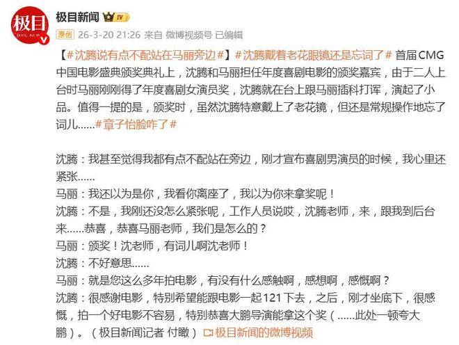 3月20日,首届CMG中国电影盛典的颁奖礼现场,沈腾与马丽这对被观众戏称为黄金搭档的组合一上台,瞬间就将庄重的颁奖典礼变成了活色生香的即兴喜剧舞台。沈腾先是一句自嘲:我甚至觉得有点不配站在马丽旁边,配上马丽精准而机智的接梗:我看你离座了,我以为你来拿奖呢!短短几十秒钟,二十年的默契就像空气中流动的化学反应,被观众一览无余。现场笑声此起彼伏,每一个眼神、每一个停顿都像是在述说着两人之间多年培养出的默契。