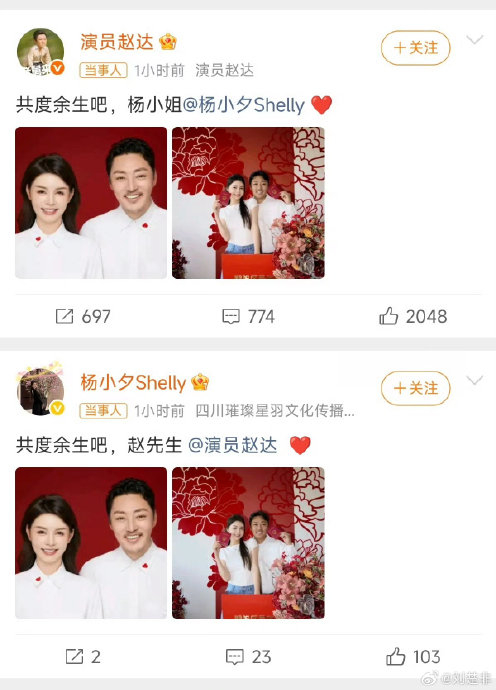 演员赵达与圈外女友杨小夕于2026年4月11日以一句“共度余生吧”的简洁告白官宣婚讯,两人同步晒出红底结婚照,低调温馨的举动不仅收获全网祝福,更引来董璇、周也等明星好友的真诚道贺。