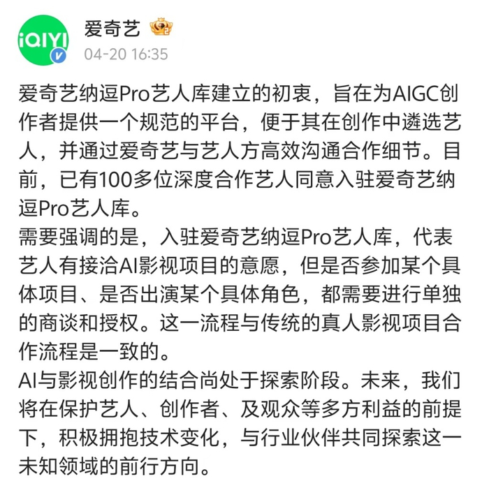 爱奇艺紧急公关,声明入库艺人仅表达“有接洽AI影视项目的意愿”