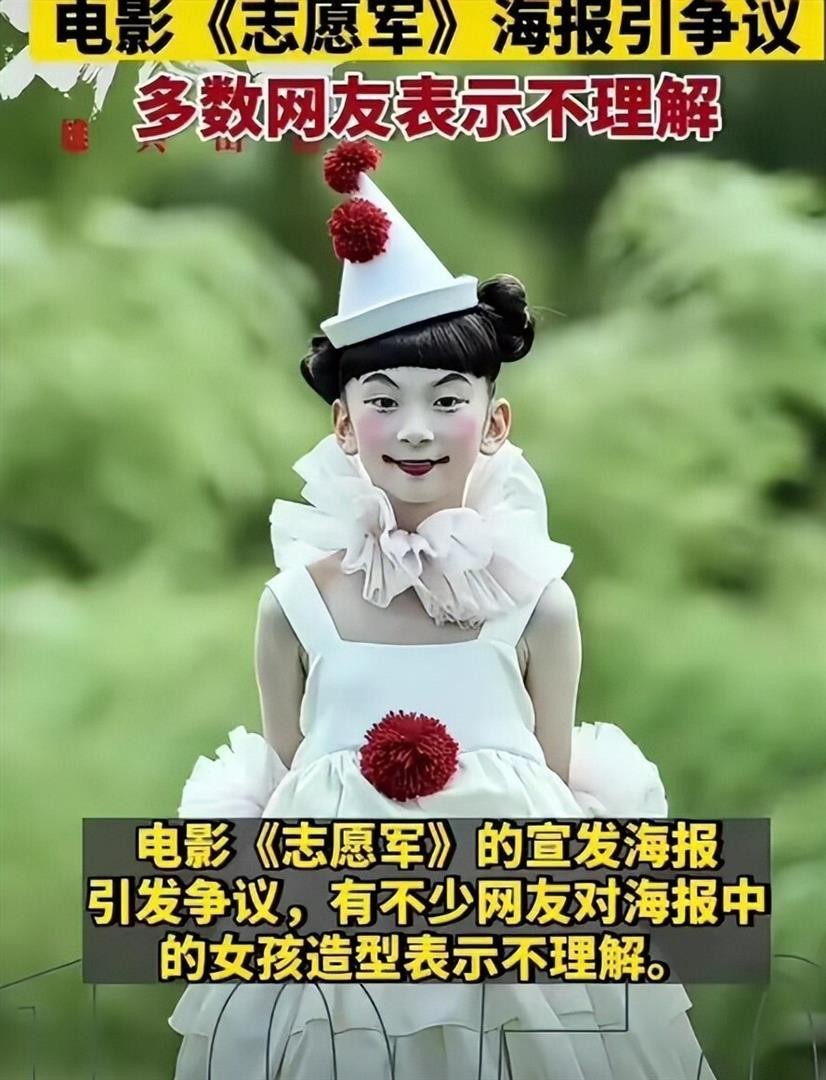 海报里的小女孩穿着白色裙装,佩戴红色花朵,妆容诡异,身上衣服的花纹被网友指出酷似日本太阳旗,还有人说造型像日本艺伎。