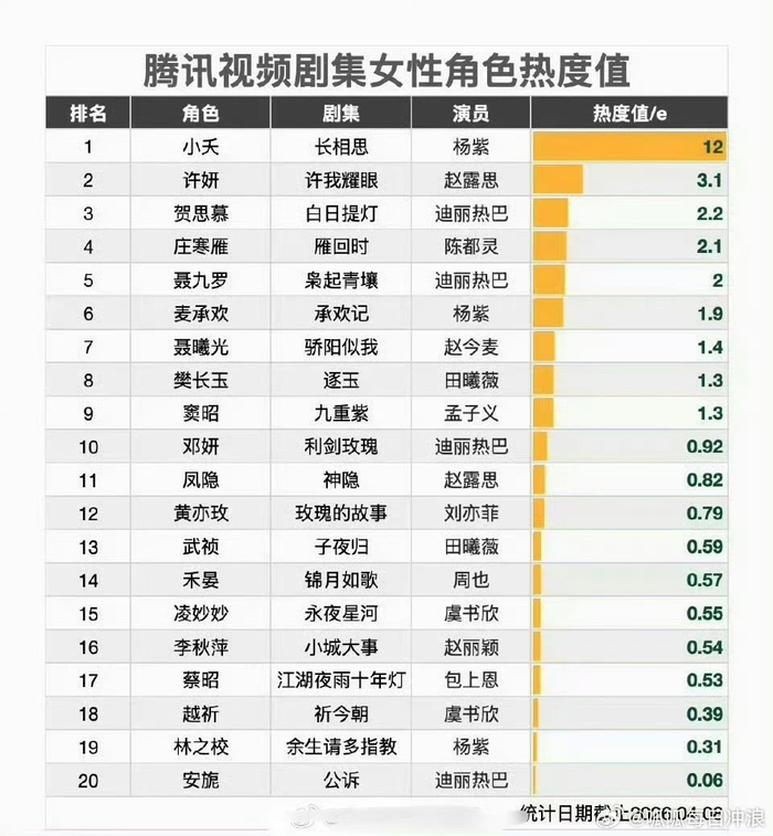 腾讯视频剧集女性角色热度值:杨紫、赵露思、迪丽热巴前三。