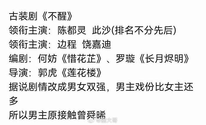 据说新剧的剧情也改成双强人设了,男主戏份比女主还多,看得出来此沙的古装在业内的认可度了啊,那就坐等开机叭~