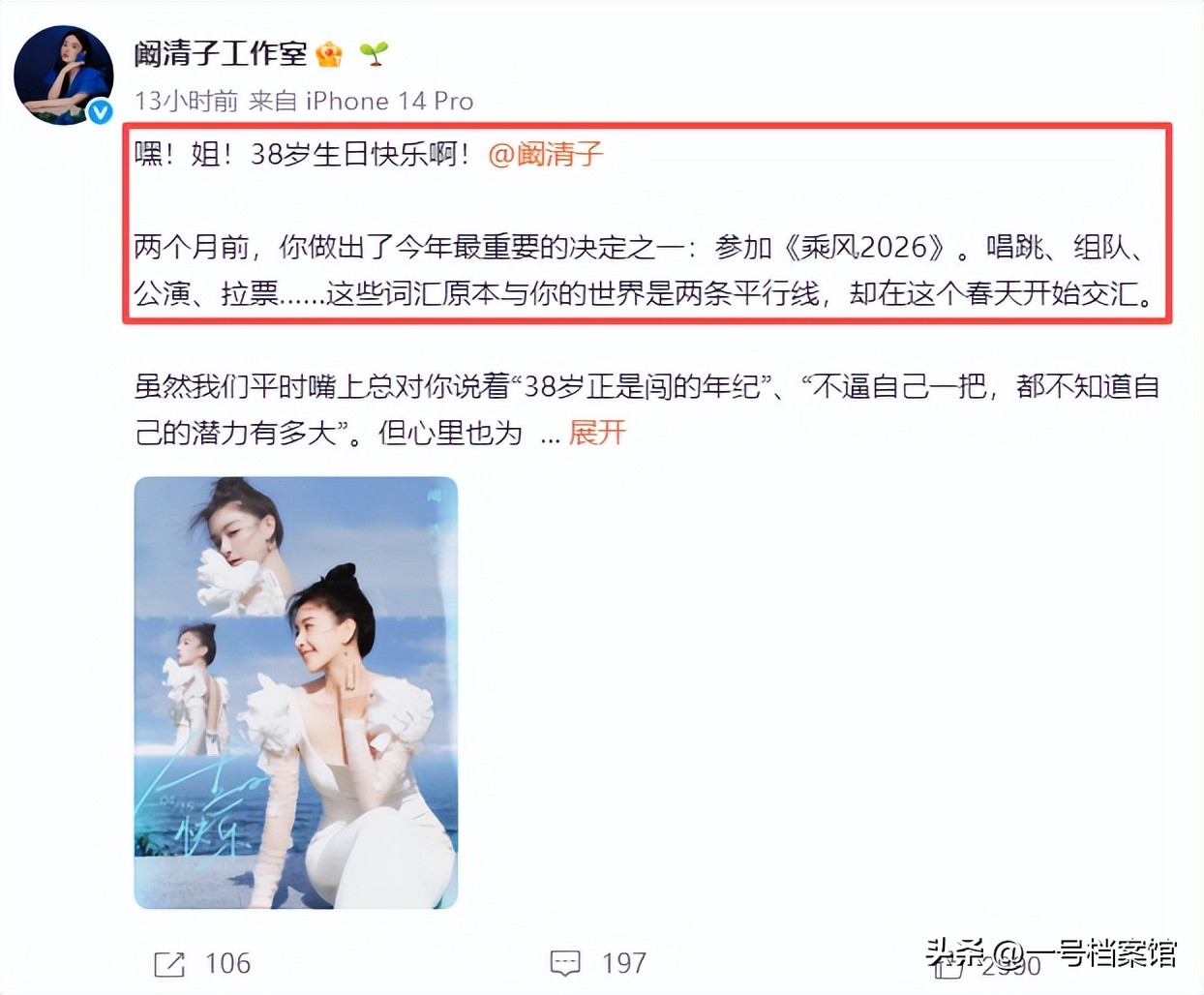 4月15日,阙清子迎来了自己的38岁生日,工作室发文祝她生日快乐了的同时,也曝出了她腰伤的内情。