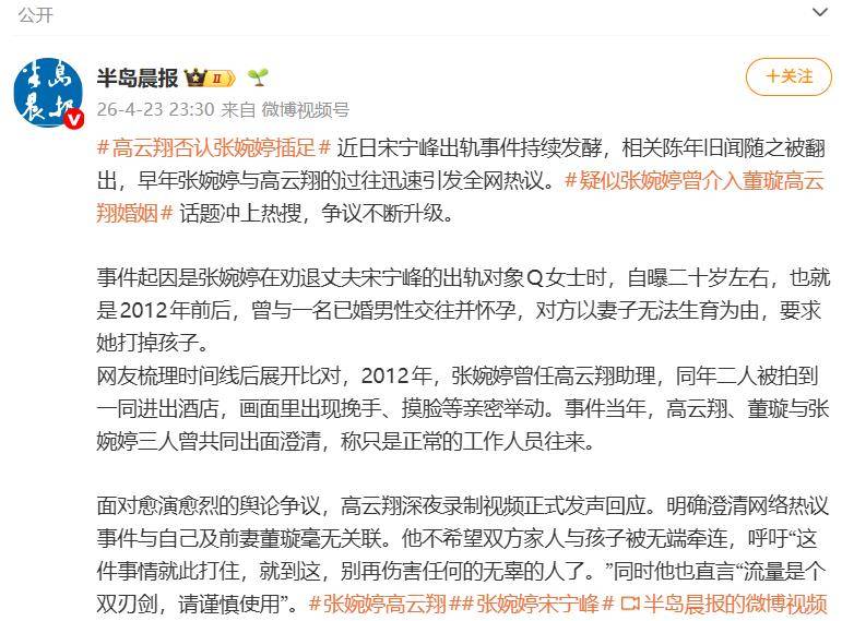 ## 高云翔否认张婉婷插足:这件事跟我和我的前妻董璇没有任何关系,网络世界仿佛开了一个“吃瓜工厂”,不断推出着各式各样的八卦,最新上线的剧情是:演员宋宁峰出轨风波持续发酵,意外掀开了一场尘封多年的旧事,随着张婉婷自曝早年曾与已婚男性交往怀孕的言论被扒出,网友迅速将矛头指向了她曾担任过助理的高云翔,一段“张婉婷曾插足高云翔婚姻”的传闻,在2026年4月23日冲上热搜,舆论漩涡再度席卷。,面对愈演愈烈的网络争议,高云翔于4月23日深夜录制视频公开回应,画面中他神情严肃,语气却克制平静,明确表示:“近期网络热议的事件,跟我和我的前妻董璇没有任何关系。”他强调,自己选择站出来发声,是不希望双方家人和年幼的孩子被无端牵连,恳请大家“到此为止,别再伤害任何无辜的人了”,视频最后,他意味深长地补充了一句:“流量是一把双刃剑,请谨慎使用。”,这场风波的引爆点,源于张婉婷与丈夫宋宁峰的婚姻危机,在劝退丈夫出轨对象Q女士的过程中,张婉婷自曝二十岁左右,曾与一名已婚男性交往并怀孕,对方以“妻子无法生育”为由,要求她打掉孩子,这段本属于家庭内部矛盾的对话流出后,网友迅速展开时间线比对。,2012年,张婉婷正担任高云翔的助理,同年二人被拍到一同进出酒店,画面中出现了挽手、摸脸等亲密举动,当年,高云翔、董璇与张婉婷三人曾共同出面澄清,称只是正常的工作人员往来,但如今旧事重提,网友将“已婚男性”“打胎要求”“助理身份”“同框画面”等碎片拼凑在一起,舆论迅速发酵,“张婉婷曾插足高云翔婚姻”的话题阅读量飙升至数亿。,与当年三人联合辟谣的被动局面不同,高云翔此次主动录视频澄清,态度更为直接和坚决,他没有回避,没有含糊其辞,而是干脆利落地将事件定性为“与我及前妻无关”,这一做法被不少网友评价为“难得清醒”,毕竟在流量至上的时代,许多人巴不得蹭上话题热度,而他偏偏选择了“灭火”。,高云翔与董璇的婚姻早已画上句号,双方各自重启生活,而张婉婷与宋宁峰的婚姻纠葛尚未收场,如今又被旧事裹挟,三人再度被推向风口浪尖,高云翔在视频中反复提及“不想让孩子受影响”,他的担忧并非多余:一旦这种未经证实的八卦成为标签,当事人或许能靠时间淡化,可孩子未来的成长环境、社交圈、甚至上学都可能因此蒙上阴影。,身为公众人物,主动在谣言扩散前站出来澄清,需要的不只是勇气,还有对身边人的责任感,毕竟,网络世界里的“一句话”可以轻易推翻,但扎进现实生活的“一根刺”,却可能一辈子都拔不出来,高云翔选择在这个时候发声,与其说是为自己辩解,不如说是替那些真正无辜的人,喊了一声“停下”。高云翔在面对网络热议时展现了冷静和克制,明确表示事件与他无关,并希望避免无端牵连,他的态度值得肯定,因为在流量至上的时代,选择澄清和保护家人名誉确实不易,这一事件也提醒我们,私人生活不应成为公众话题,而言论也应避免对他人家庭造成负面影响,高云翔的回应体现了对家庭的重视和对未经证实信息的理性对待,值得尊重。