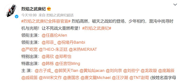 10月26日,武庚纪官方微博发布消息称:“烈火熊熊,破天之战如约而至,少年承诺,在混沌中寻找机遇和光明。” 让不死的战火重新燃起希望! 然后宣布演员阵容。
