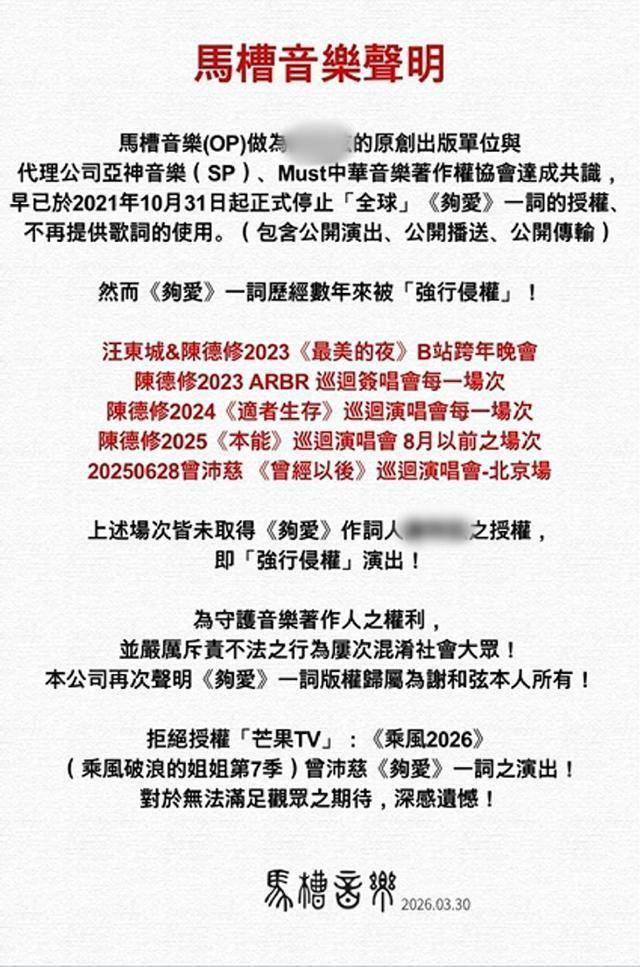 2026 年 3 月,《乘风 2026》节目组正式申请《够爱》授权,马槽音乐立刻发声明拒绝,明确禁止芒果 TV 使用歌词。节目组不敢冒法律风险,曾沛慈只能忍痛放弃,初舞台与《够爱》彻底无缘。