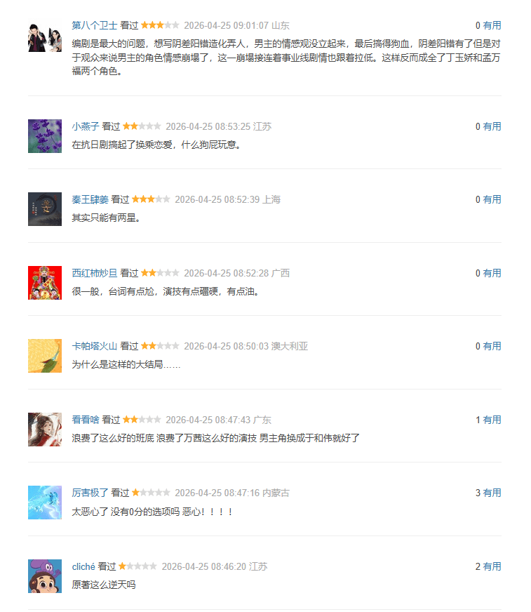 第一批次消失的,是我基于具体桥段,论证王阳表演问题的一些剧评分析。第二次消失的,是我差评该剧的一些剧评分析。第三批次消失的,则是我对万茜表演进行好评论述的分析。无论差评还是好评,都被“三体人”带走了。于我内心,毫无波澜。这些评论,更像是药方,治病救人于剧作罢了。“三体人”为何看不得药方,我亦不必揣测了。
