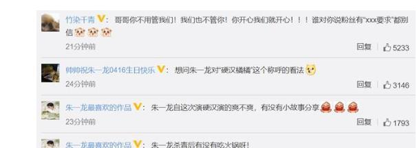 翻看非常热闹的评论区,热评说出小笼包心里话:哥哥你不用管我们,我们也不管你,你开心我们就开心,谁对你说粉丝有“要求”,不要相信哦!有小笼包调侃道:想问朱一龙对“硬汉橘橘”这个称呼的看法。还有小笼包直言:龙哥这次硬汉洪翼舟演得如何?有没有小故事和我们分享?《无限深度》杀青后有没有吃火锅?隔着一块屏幕,小扒都能感受到小笼包对朱一龙生日“云聚会”满满的期待。