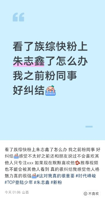 元气形象下的脆弱感与倔强感,进一步强化了粉丝的深度共情。物料策划的刻板化曾掩盖朱志鑫“冷脸萌”的反差魅力,引发粉丝抗议“抹杀真实个性”;苏新皓因“不愿屈服公司操控”被边缘化的传言,则凸显其“执拗坚守自尊”的棱角。这种“不完美”反而让粉丝感受到偶像作为“人”的挣扎。高强度工作下成员“早上七点忙到凌晨两三点”的日常,更让粉丝心疼其元气背后的疲惫,自发以“溺爱”心态对抗外部压力。粉丝对偶像的理解从娱乐消费升华为情感守护,如网友感慨:“他们再怎么装坚强也还是小朋友啊”。
