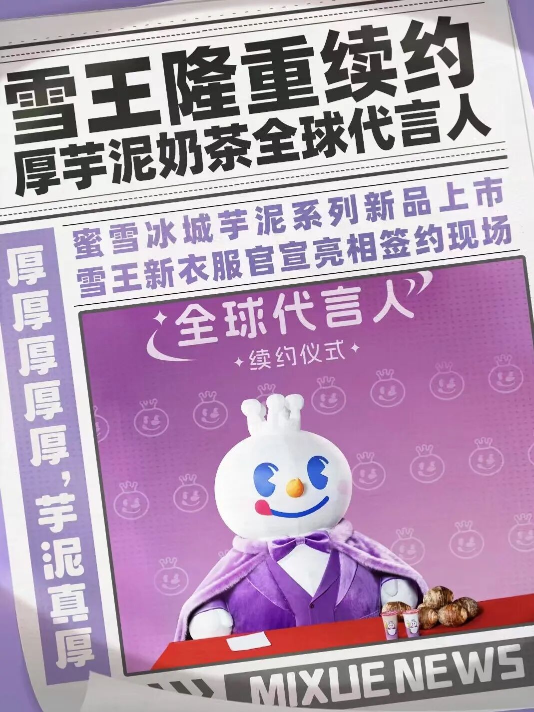 不过有一个品牌例外,蜜雪冰城的代言人全权由自有IP“雪王”代理,不设其他。这一独特性,也令蜜雪冰城在全球范围内树立了高识别度、高接受度等形象鲜明的标志。