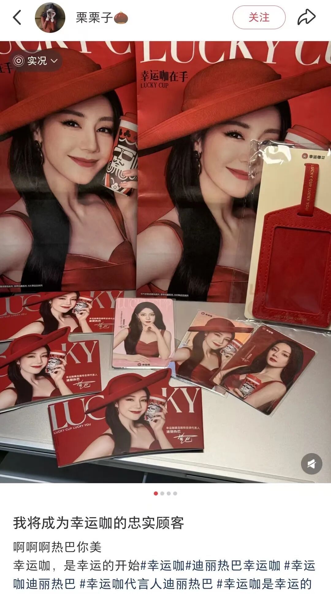 在幸运咖的代言人体系中,迪丽热巴为“臻选咖啡全球代言人”,梁朝伟为“品牌代言人”。自官宣起,幸运咖在社交平台、线下门店发起形式多样的互动打卡、抽奖活动,并推出丰富的代言人限量周边、产品周边,吸引众多消费者前往。