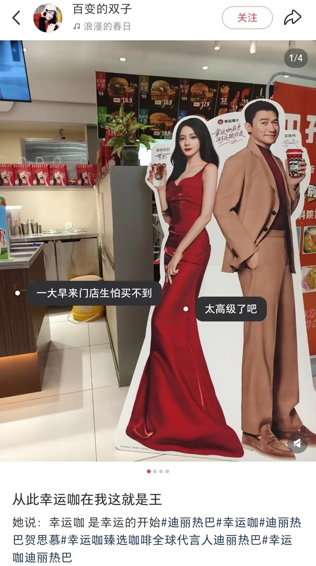 4月19日,幸运咖正式官宣迪丽热巴、梁朝伟出任品牌全新代言人,由两位联袂出镜的全新品牌TVC上线,门店主题包材也焕新。