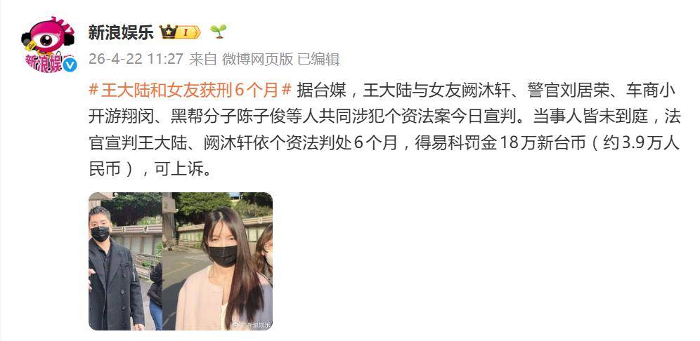 **从银幕上的“徐太宇”到法庭判决书上的被告:王大陆的“闹剧”之旅**,在台湾的娱乐圈里,王大陆这个名字曾经红红火火,是很多人眼中的“徐太宇”,这位曾经风靡一时的艺人却在这一次“闹剧”中,彻底“走了偏门”,不仅让人捧腹,更让人感叹人情冷暖的无奈。,事情的起因是一场债务纠纷,王大陆的女友阙沐轩曾遭遇高达400万台币的投资诈骗,虽然通过法律途径取得了胜诉,但诈骗分子携带款项逃逸,钱款始终追不回来,面对这场“血案”,这对情侣选择了一条“非常规”的道路——他们以150元新台币的价格,非法联系上了黑帮和警官,试图通过“讨债”找回损失。,这场闹剧的幕后,堪称一部现实版的“警黑勾结”电影,王大陆通过一名车商人脉,联络上了黑帮分子陈子俊和警官刘居荣,他们非法获取了债务人潘某家属的身份证号、家庭住址等核心个人隐私信息,甚至伪造了公文,假装是警方的调查结果,上门施压、伪造文书、警官勾结……这一系列操作,不仅让他们自己陷入了法律的泥潭,更将一名警官送进了监狱。,法院作出了宣判:王大陆和阙沐轩各被判处6个月有期徒刑,均可通过缴纳18万新台币罚金来替代服刑,涉案的黑帮分子陈子俊和车商游翔闵则各被判3个月徒刑,而那位知法犯法的警官刘居荣,罪重最重,被判处1年4个月有期徒刑,且不可易科罚金,必须入狱服刑。,这场“讨债变涉黑”的闹剧,不仅让人捧腹,更让人唏嘘,从银幕上的“徐太宇”到法庭判决书上的被告,王大陆的选择 truly 不仅让他自己背上了刑案记录,更将一名警官送进了监狱,这种“闹剧”的代价,真的不小。,这起案件也给所有公众人物敲响了警钟:法律的红线,碰不得,无论是私人纠纷,还是公众人物之间的矛盾,都要遵守法律的底线,选择“闹剧”或“非常规手段”,不仅会让自己陷入法律的泥潭,更会让那些曾经的“友人”或“合作伙伴”背上冤屈的锅。**大陆小哥的恋爱刑情剧:从“讨债”到牢狱,爱在刑间** ,台湾的娱乐圈又上了个热搜!曾经红极一时的小哥王大陆,卷入了一场自己也无法掩饰的“恋爱刑情剧”,这场戏码不仅感动了观众,也让所有人看清了“法律红线”的分量。,**剧情大纲:**,王大陆和女友阙沐轩的爱情故事本可以写成一部励志剧:年少的女孩遭遇高额投资诈骗,损失惨重;但是他们选择了“非常规”方式讨债,结果自己也掉进了法律的深渊。,起因是阙沐轩被诈骗损失400万台币(约合8.8万人民币),虽然通过法律途径赢了诉讼,但钱款依然未能追回,这一“小事”让这对情侣选择了“硬核”解决方式:他们通过车商游翔闵,联络上了黑帮分子陈子俊,还有一个“铁哥”警官刘居荣,花150元新台币非法买得了债务人潘某家属的核心个人信息。,**票根难看:**,这场“讨债”戏码却没像预期的那么顺利,他们拿到信息后,直接上门“提线索”,结果这一系列操作不仅坐实了非法获取个人资料的罪名,还揭出了伪造文书、公务员与黑道勾结的更大案件。,**终极大结局:**,法庭的判决果然比电视剧更有看点:王大陆和阙沐轩各自被判6个月有期徒刑,可通过缴纳18万新台币(约合3.9万人民币)罚金替代服刑,而那位“铁哥”警官刘居荣因为涉嫌伪造公文、公务员登载不实等罪,被判1年4个月有期徒刑,且不可易科罚金,必须老老实实地去服刑。,**教训:**,这场闹剧给所有人敲响了警钟:法律红线,真的不能踩,无论是感情之情,还是金钱诱惑,都不能成为越界的借口,更何况,公众人物更应该做好榜样,不能轻易涉足违法犯罪的泥潭。,****,从银幕上的“徐太宇”到法庭上的“大陆小哥”,王大陆这次“为女友出头”的选择,堪称一部“爱在刑间”的经典剧情,或许在看完这个故事后,我们都要好好想一想:真正的爱,是不是应该在法律和道德的框架内来展现?