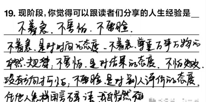 辛芷蕾曾分享过这么多年陪伴自己的人生信条,每次在最难的时候默默地念着,一共就九个字,那就是:不着急,不害怕,不要脸。