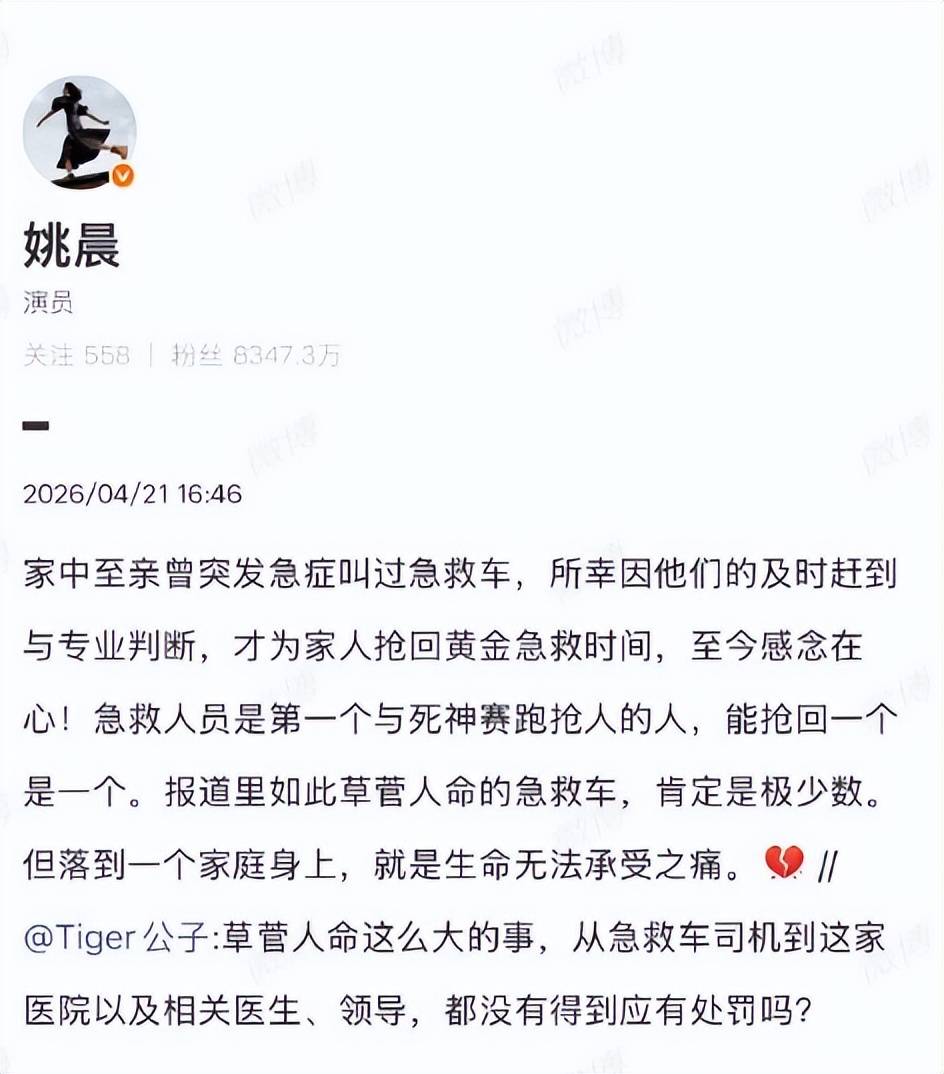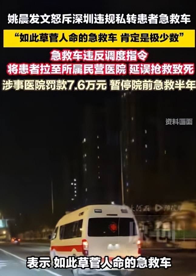 **“救护车改道,生命通道被践踏”——姚晨发声引发的公众愤怒与对急救体系的深度思考**,“姚晨发声”这四个字,在近日的网络舆论中掀起了一股热浪,犹如一滴石子激起的涟漪,这位演员以一段沉寂近八个月的悲剧为起点,重新点燃了公众对生命安全的关注,也撕开了急救体系管理中的一个深层黑暗。,这场悲剧始于2025年8月5日凌晨,54岁的张女士在剧痛中被惊醒,丈夫陈有为拨通了120,按照紧急情况处理流程,患者应被送往仅2.8公里外的公立三甲医院——龙华区人民医院,深圳市健安医院的救护车却“配上”了不同的目的地——3.8公里外的自家民营医院,这种“改道”不仅违反了120调度指令,更像是对生命通道的冷漠践踏。,当救护车偏离正确路线后,这位普通家庭的生活就彻底被改写,八小时的漫长黑夜里,张女士在健安医院的急诊室里失去了意识,未能得到及时的止血介入,在目标医院进行手术时,已经无法挽救她的人命,更令人发指的是,救护车的改道行为竟然被医院当局“默许”甚至“保护”,直到调查结果公布才被曝光。,2026年4月8日,深圳市卫健委的调查结果如同一盆冷水,将健安医院的行为定性为“恶劣、情节严重,破坏公共救援体系根基”,对其处以7.6万元罚款并暂停院前急救资质半年,但在公众和逝者家属看来,这种处罚似乎与行为的严重性相比,显得过于轻量,网友们纷纷质疑:“延误救治人命,直接导致生命延误,这等于谋杀!7.6万元的罚款,能否补偿一个家庭的痛苦??”,姚晨的发声,恰如一把火,点燃了公众对急救体系的深度思考,这不仅仅是一个简单的违规事件,而是对公共信任基础的严重侵蚀,当救护车不再是“就急、就能力”的最后防线,而是被医院利益驱动成“血盆教匠”,每一声“120”都可能成为生命安全的“Death Note”,这确实令人深思。,这场悲剧撕开了急救体系管理的伞幕,暴露了其中的腐败与失序,公众的愤怒与姚晨的诘问,共同构成了对生命尊严的维护,也对急救体系的管理提出了一系列尖锐问题:如何建立更加严密的监管机制?如何确保救护车始终以救死扶伤为本?这些问题的答案,不仅关系到每一个家庭的安全,更关系到整个社会的文明进程。,在这个人人都可能成为“深夜等待救援的普通人”的时代,我们对急救体系的信任,实在是太过可贵,而姚晨这一次发声,不仅是对一个家庭的追责,更是对整个社会的警示:生命通道不容亵渎,必须用最严格的监管与最严厉的惩处,守住那条绝不能失守的最后防线。