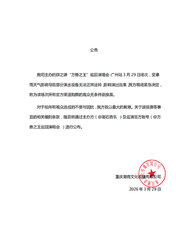你见过演唱会演到一半给全场退钱的吗?你见过明星主动说"效果不好,我不配收你钱"的吗?昨晚广州,薛之谦做到了。3月29日,强对流天气突袭羊城,暴雨加冰雹砸向天河体育中心。价值过亿的L1音响哑了,93米宽的巨型舞台灯光全灭,数万只荧光棒成了摆设。演出进行一小时后,浑身湿透的薛之谦拿起话筒,宣布了一个让全场沸腾的决定:全额退票,外地粉丝机酒全包。