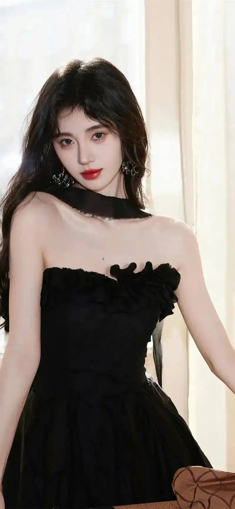 鞠婧祎穿着黑色抹胸衣裙,她头戴凤冠,手上带着修长的黑手套,坐在墙壁边上,露出白皙的香肩和事业线,大秀曼妙的身材曲线,绝对性感撩人!