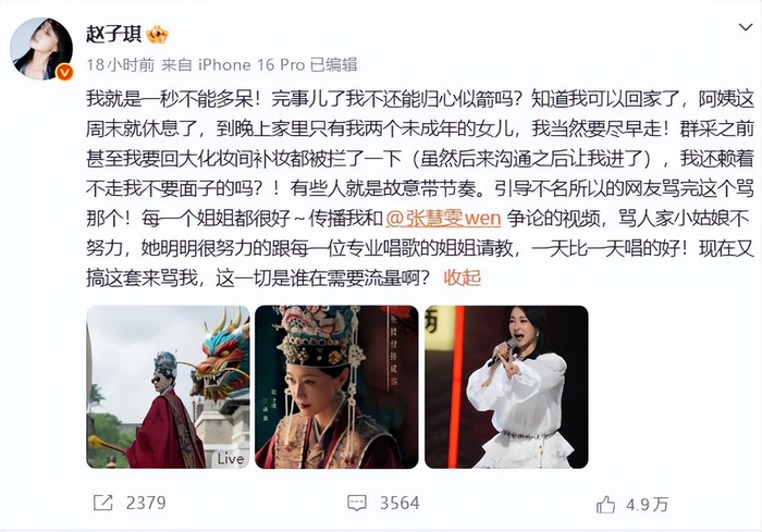 于是,赵子琪选择了一种截然不同的“离场姿态”。淘汰后凌晨,她发文“我一点都不难过!不会再来!”。4月12日,她再度发文,以凌厉笔触回应种种猜测:“我就是一秒不能多呆!……我还赖着不走我不要面子的吗?!”她解释归心似箭是因为家中只有两个未成年女儿需要照顾,并直指有人“故意带节奏”,引导网友互骂以博取流量。她特别为队友张慧雯辩护,称其非常努力,驳斥了流传的“不努力”指控,并在评论区留下“惹我我就直播!”的强硬宣言。