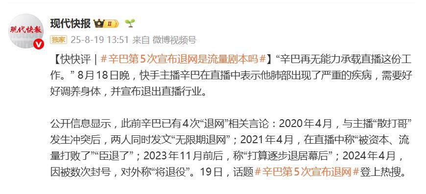 据悉,此前辛巴已有5次“退网”相关言论:2020年4月,与主播“散打哥”发生冲突后,两人同时发文“无限期退网”;2021年4月,在直播中称“被资本、流量打败了”“臣退了”;2023年11月前后,称“打算逐步退居幕后”;2024年4月,因被数次封号,对外称“将退役”。2025年8月18日,在直播中表示他肺部出现了严重的疾病,需要好好调养身体,并宣布退出直播行业。