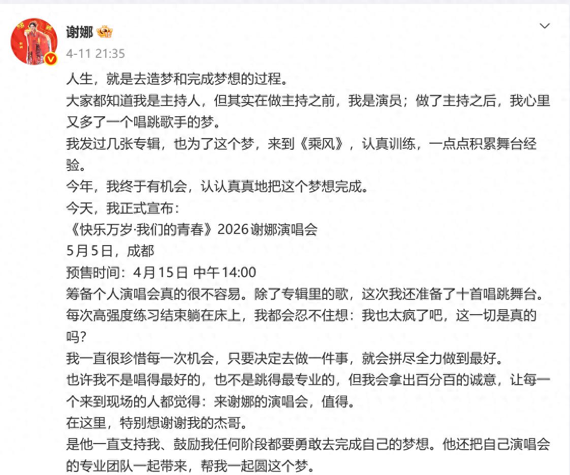 4 月 11 日晚,谢娜在《乘风 2026》一公直播现场突然官宣将于 5 月 5 日在成都举办个人首场演唱会 “快乐万岁・我们的青春”。然而,这一消息在不到 24 小时内便引发了全网热议,热搜榜首的评论区更是被 “吃相难看” 等言论刷屏。