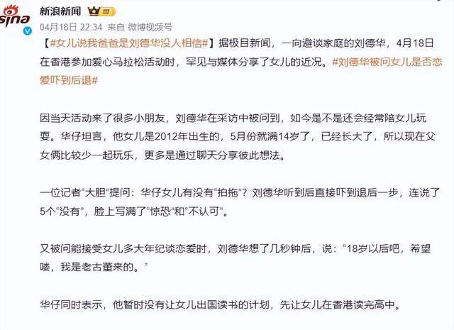 **吃瓜简评:刘德华被问女儿是否恋爱,吓到连说五个“没有”**,刘德华在香港爱心马拉松活动现场的一段采访视频引发了网友们的热议,被问及女儿是否恋爱的瞬间,这位“华仔”瞬间转变成了“普通父亲”,连说五个“没有”,脸上写满了惊恐,这一幕不仅戳中了每个父亲的心,也让人看到了父爱的真实面貌。,作为一个顶级明星,刘德华在台上风风光光,光芒万丈,但当提到女儿时,他却像个普通父亲,连忙后退一步,连声否认,这种反应让人既为之嗤笑,也为之动容,因为不论是顶流天王还是普通的“护崽老爸”,在父爱面前,都是同一个模样——笨拙、真诚又柔软。,从事件的背景来看,刘德华对女儿的保护是毫无保留的,他坚决拒绝亲子综艺邀约,遮挡女儿的正脸,选择国际学校避免过度关注,甚至陪女儿做那些普通父亲才会做的事,比如辅导功课和拼乐高达四小时,这种极致的保护,展现了父亲对女儿的深切关怀。,这种保护也带来了意想不到的后果,女儿在学校因为父亲的低调作风,遭遇了“甜蜜的烦恼”,她向同学宣称“我爸爸是刘德华”,却因为父亲的朴素接送和不张扬的行为,被同学质疑“吹牛”,甚至被回呛“滚”,这让刘德华感到好笑,因为他成功地为女儿筑起了一道隔绝明星特权的围墙,让她拥有了不被特殊目光审视的平凡童年。,网友们对刘德华的表现给出了高度评价,称他的父爱是“顶配版”,无论身份多么显赫,父爱都是最真实的表现,在刘德华身上,我们看到了传统父爱的缩影:台上是叱咤风云的天王,台下却是为女儿煎心形鸡蛋、蹲在路边啃鱼蛋的普通父亲,这种对女儿的全面保护,不仅是资源的倾注,更是对女儿成长权利的最大尊重与守护。,刘德华的表现不仅让人感动,也让我们思考:作为父亲,我们是否也能在某些时候,像他一样,连说五个“没有”,为女儿的成长和平凡而心疼?父爱的真实面貌,往往是在这些细微的瞬间中展现出来的。刘德华这位“顶流老爸”在香港爱心马拉松现场被问到女儿是否在谈恋爱时,连说五个“没有”,瞬间从光芒万丈的“华仔”变成了一只紧张兔子,这一幕不仅戳中了每一位父亲的共同软肋,更让人看到了父爱的另一面——那是一种笨拙、真诚又略显滑稽的本能。,作为一个多年走红的顶流,刘德华在台上总是一派风风火火的形象:领衔大型演出、横扫各类奖项、成为娱乐圈的顶级人物,可是在女儿面前,这位“顶配版父亲”却完全崩了套,从拒绝亲子综艺到选择国际学校,从低调接送到刻意安排女儿的学习环境,刘德华用尽一切方式来保护他的“小公主”,甚至在拍戏时,他还特意让女儿选择一个附近的学校,以便能更贴心地陪伴她。,可这位“普通父亲”在女儿面前却又显得少许滑稽,记得有次在家长群里,他的备注仅仅是“刘向蕙爸爸”,简直像个普通职员,这一幕让人忍不住笑出声来——这位顶流天王竟然连“刘德华”都不会写进备注里,完全沉浸在“老爸”这个角色里,更有趣的是,他的女儿Hanna在学校里因为“爸爸是刘德华”而被同学质疑“吹牛”,这场“甜蜜的烦恼”让刘德华觉得“特别好玩”,这背后折射出的,是他对女儿想要筑起一道“无明星特权”的防线,让她能过上平凡而真实的童年。,刘德华的这种极致保护,既可爱又让人心疼,他为女儿煎心形鸡蛋、蹲在路边啃鱼蛋,陪她打游泳、辅导功课、拼乐高达四小时,这些画面简直让人怀疑:这位顶流天王是不是把女儿当成自己的女儿,而不是娱乐圈的一部分,王晶导演曾感叹,刘德华的女儿是他们“盼了很久才得到的宝贝”,这句话道出了这位父亲的心意:女儿的成长权利是他的最大财富。,无论是刘德华在台上的风云还是在家里的普通,父爱始终是最真实的自己,那些“没有”、那些闪现的惊恐、那些低调的保护,都是父爱最动人的模样,或许这就是父爱的魅力——它既不需要耀眼的光环,也不需要喧嚣的风光,就能温暖一个孩子的成长之路。