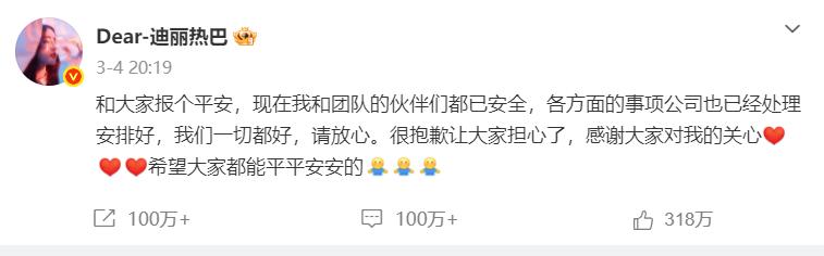 “给大家报个平安,现在我和团队的伙伴们都已安全,各方面的事项公司也已经处理安排好,我们一切都好,请放心!”