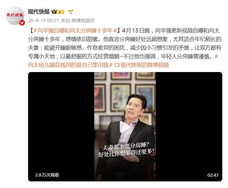 不过,向华强也在视频中特意补充提醒:年轻人对待分房睡需谨慎,不应盲目效仿。