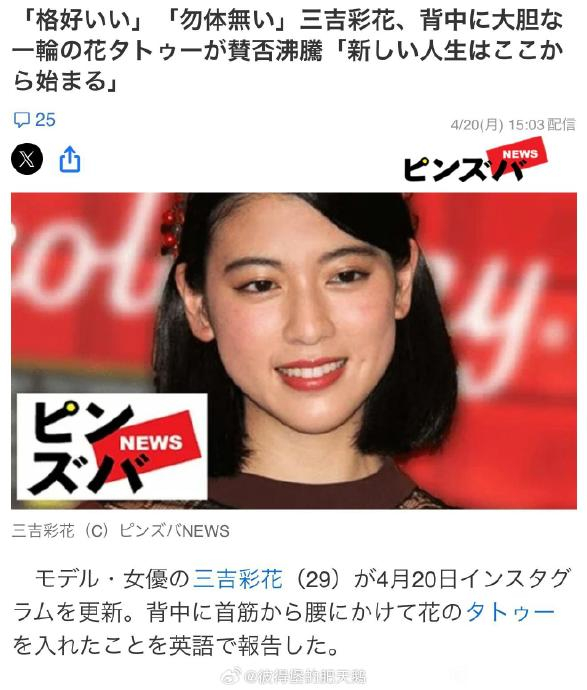 **三吉彩花的30岁“人生新篇章”:纹身与事业双双升级,气场全开!**,日本模特兼演员三吉彩花(29岁)在社交媒体上官宣了一件重大的“生鲜事儿”——在颈后到腰部纹上了生日花蜀葵!配上露背黑裙的大片,简直气场冲天,网友们都在疯狂讨论这件“艺术品”!作为一个正在事业风暴发酵的29岁“小妹子”,她居然在30岁时选择这样一件大刀阔斧的决定,实属“高手级”!,纹身背后的故事更是让人惊叹!三吉彩花表示,这是对自己忠诚的象征,标志着她的人生新篇章开启,为了这件“人生大事”,她和事务所沟通了两三年,才下定了这个“大胆”的决心,可以说,这不仅是对自己的热爱,更是对未来的一份美好承诺。,事业方面,三吉彩花也是一波“双双升级”!她接下来的项目包括国内知名大作《王者天下》以及韩国备受期待的电影《老千》,国际化路线一马当先,作为一个多才多艺的艺人,她在模特和演员两头开花,完全不愧对自己未来的人生规划。,网友们的评价褒贬不一,真是“观众众说众说”,有人说她“又美又飒”,比起之前的“精致”更加高级,纹身也太“高级”了吧!还有人觉得“可惜”,毕竟她已经是29岁了,不知道是多大努力才能在事业上走到现在的地步,无论如何,这个纹身绝对是她人生中的一件“大事”,值得用一辈子回味。,三吉彩花用自己的方式演绎着“新人生”,她不仅在事业上屡屡出彩,更用行动诠释着对自己的人生态度,无论是纹身还是接下来的项目,都是一种对自我的认可和追求,作为观众,我们可以为她喝彩,为她加油,期待她未来更精彩的表现!