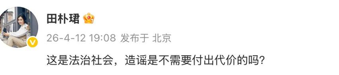 4月12日晚,田朴珺发文回应:这是法治社会,造谣是不需要付出代价的吗?