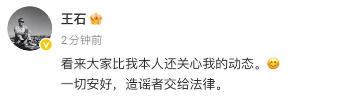 随后,王石本人回应:看来大家比我本人还关心我的动态。一切安好,造谣者交给法律。