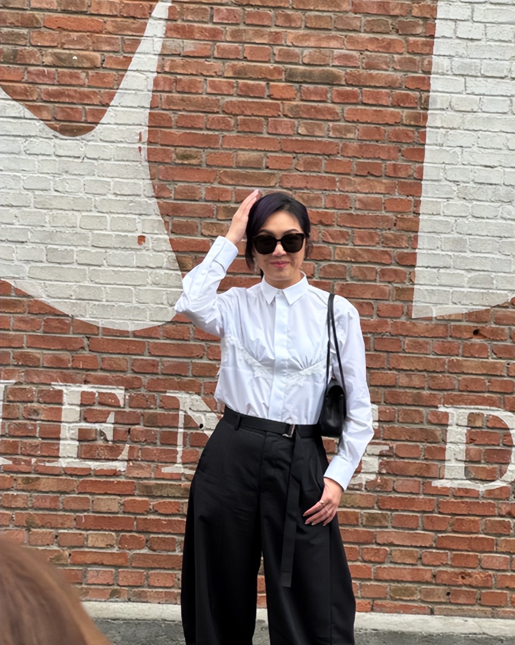 她上身是基础款白衬衫,干净简约,下身搭配灰色阔腿裤,面料柔软宽松,头发扎成低马尾,留着轻柔斜刘海,造型毫无修饰感。