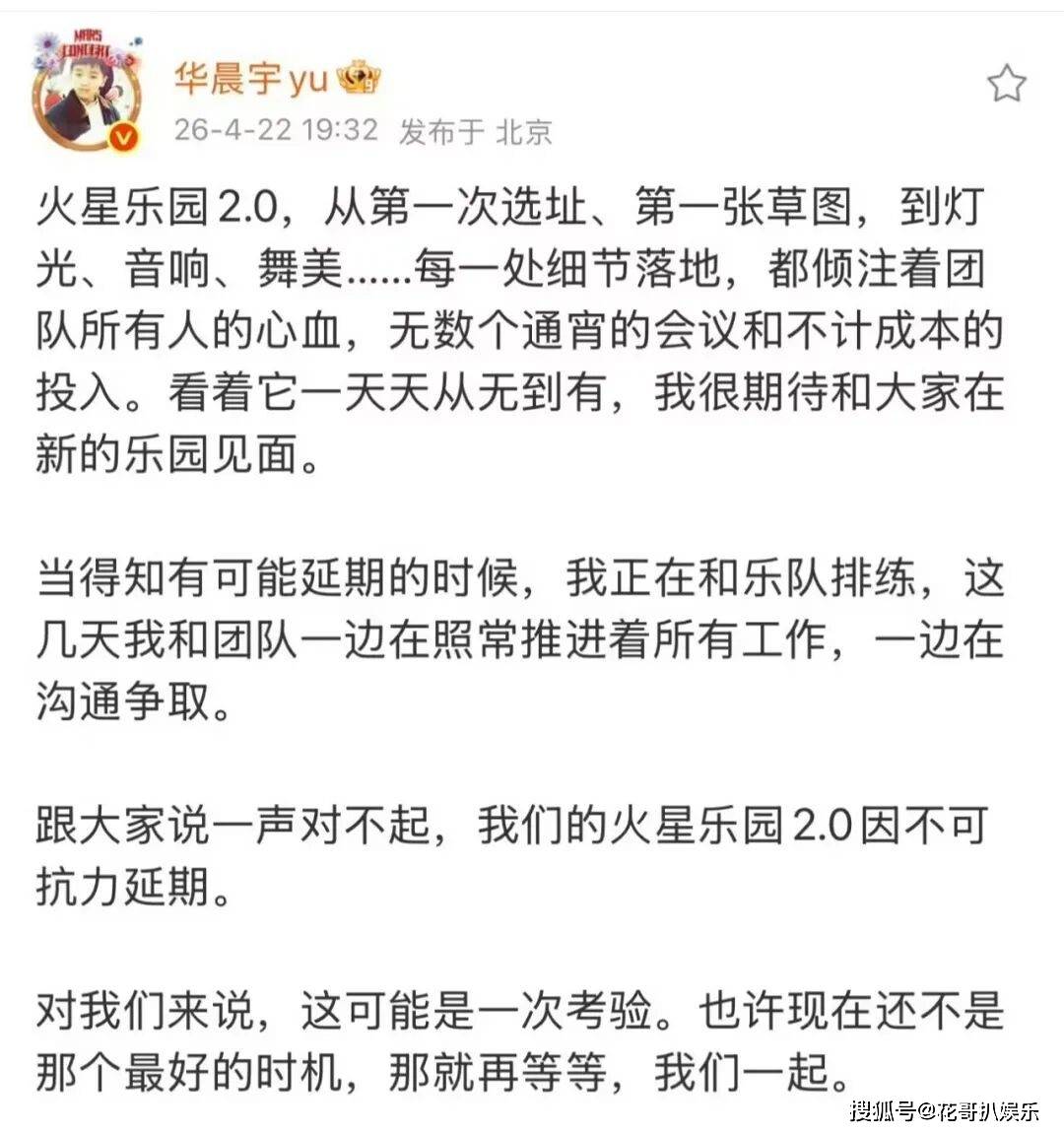 前不久,华晨宇还兴奋地和粉丝宣布,自己包了一块地,专供自己之后演唱会使用,结果这才过了没几天,华晨宇的火星乐园2.0演唱会就被紧急叫停。华晨宇工作室给出的原因是因不可抗力,所以演唱会只能无限期延期。华晨宇本人发文致歉,承诺会全额退票,主动承担粉丝因行程取消产生的机票、酒店退改签费用,再三道歉,还说哭了。