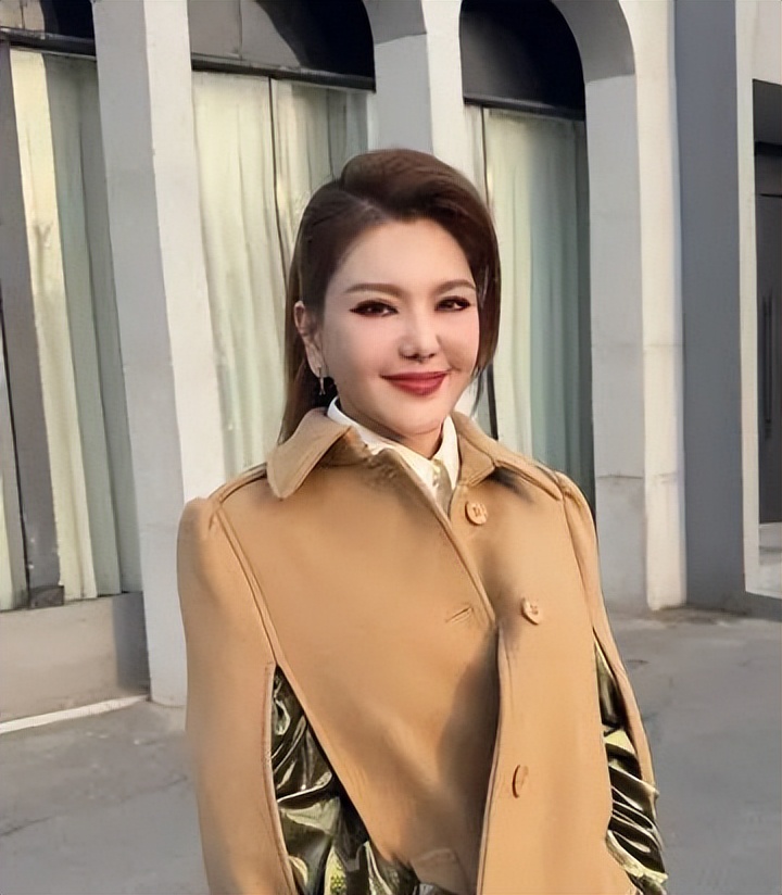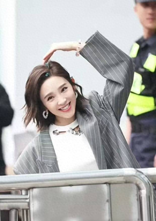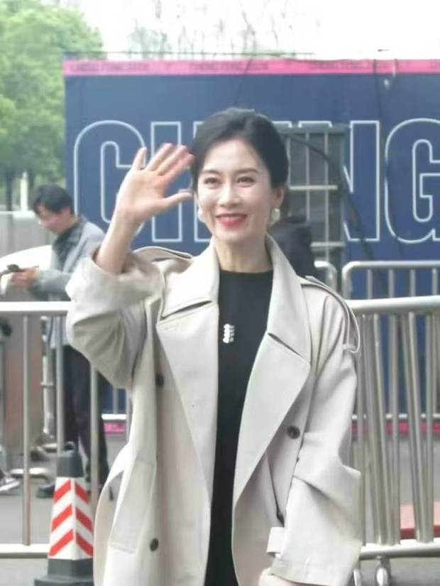 温峥嵘穿米白风衣,挥手甜笑温婉大气。