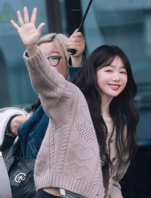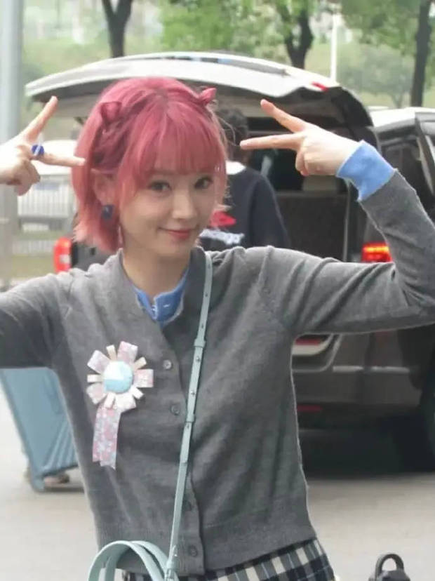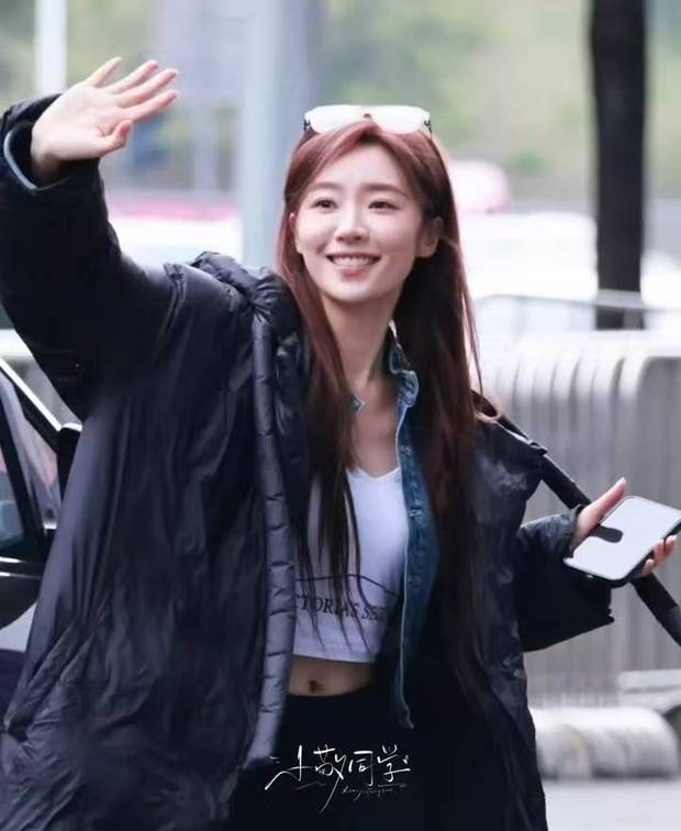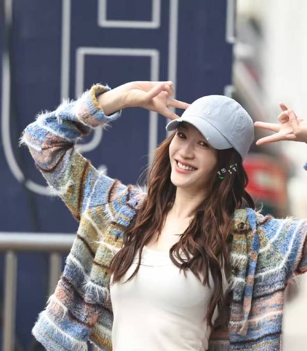 徐梦洁穿针织开衫,挥手甜笑娇俏。