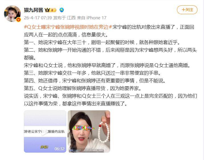 然而,这建立在“不回避”基础上的信任,最终因宋宁峰被指在双方女性间“反复传话”而彻底破裂。Q女士称,宋宁峰被指在两名女性间歪曲原意、两头传达——一方面向张婉婷声称“Q女士逼他离婚”,另一方面又向Q女士转述张婉婷的威胁言论。这种操作被指直接激化并加深了Q女士与张婉婷之间的误解和矛盾。