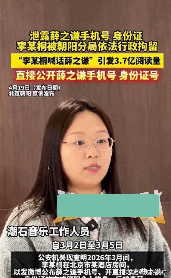 2026年4月19日下午,北京广播电视台《法治进行时》栏目曝出消息。李雨桐因泄露薛之谦手机号和身份证号,被北京朝阳警方依法行政拘留十日。拘留日期从2026年4月10日开始,到4月20日结束。