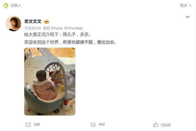 思文在个人微博上晒出了儿子的背影照,文字里流露出满满的温情:给大家正式介绍下:我儿子,多多。欢迎来到这个世界,希望他健康平顺,喜忧自安。消息一出,瞬间引起网友们的关注和热烈讨论。随后,她在自己的播客节目中,进一步分享了更多细节,并确认丈夫是一位圈外人士,身份选择低调保密。