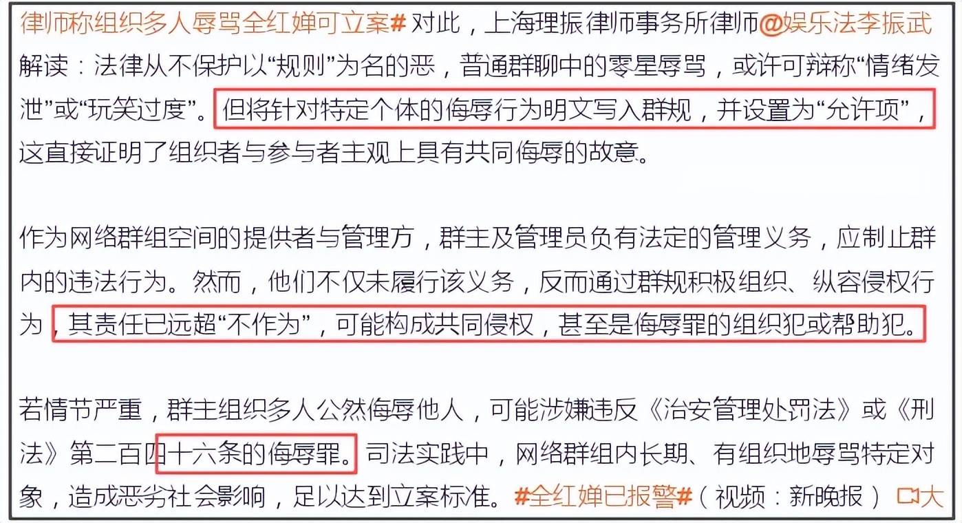 有律师也指出法律不会保护以“规则”为名的恶,若普通群聊零星的辱骂可以视为情绪发泄,但将针对特定个体的侮辱攻击写入群规直接证明了组织者与参与者主观上的故意。群主作为网络群聊的提供方,纵容侵权行为责任不仅是不作为,还可能是侮辱罪的组织犯或帮助犯。