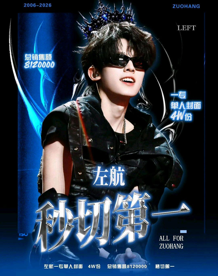 他们晒出数据表示:左航是本次专辑唯一达成双秒切的成员——单人封面+手办版全部最快售罄,上架即空,手速和购买力都相当能打。