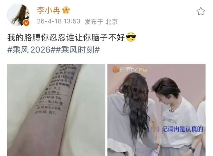 **吃瓜简评:李小冉的“脑子不好”,是她最好的特点**,在《乘风2026》二公小考这场节目中,李小冉的一举一动都让观众看到了她独特的一面,她为了记住歌词,直接在左右手臂内侧抄满了整首歌的歌词,结果让队友孙怡当场看懵,误以为她胳膊上纹了什么,直接问:“你这胳膊纹身了?”这句话一出,全场笑翻,气氛一度无法恢复。,事后李小冉在微博上自嘲:“我的胳膊你忍忍谁让你脑子不好。”这句话简直是对“笨拙”这一称号的最佳诠释,她不仅没有掩饰自己的尴尬,反而用自嘲的方式化解尴尬,还调侃了网友们“忍忍”的责任,这种真实又接地气的表现,让人忍不住为她加分。,这也不是李小冉第一次用“笨拙”圈粉了,在之前的一公表演中,她因为跑调跑到长沙,结果被网友调侃“眼睛在天堂,耳朵在病房”,面对这些调侃,她不仅没有装腔作势,反而直接在微博上写下了八个字:“不假唱、不怯场、不做作、不好听。”甚至还手滑点赞,自嘲起来比谁都狠,结果呢?越跑调越圈粉,越自嘲越上头。,更有趣的是,在节目中她还愣是拿了一公个人乘风值第一名,上台哽咽说:“我们的起跑线很低。”这句话简直是对娱乐圈“完美人设”的最大的颠覆,老公徐佳宁据说在家捶胸为之,但讲真,观众爱看的从来不是什么完美人设,就像网友说的:“终于看到明星不是完美人设了,50岁的姐姐,记性不好就用胳膊凑,跑调了也不找补,这份真实劲儿,比任何精修舞台都来得带劲。”,李小冉用她的“脑子不好”和“笨拙”来圈粉,不仅让观众看到了她真实的一面,更让人感受到明星和普通人之间的拉近,她的每一次尴尬、每一次跑调、每一次自嘲,都是她独特的魅力所在,看来在娱乐圈,真实才是最让人无法抵抗的魅力。## 纹身?抄歌词也太太太真实了吧!这才是真正的“笨拙”魅力, , 在《乘风2026》二公小考这档节目里,李小冉的表现简直就是"笨拙"大爆发!这位"老干部"为了记住歌词,直接把整首歌的歌词都抄在了自己的胳膊上,结果被队友孙怡当场误以为是"纹身",这场面真是让人捧腹不已。, , 这种"笨拙"的表现力,堪称"真实至上"的典范,李小冉不仅没有在节目中装腔作势,反而直面自己的"笨",甚至在微博上大意取悦自己"脑子不好",这种不拘小节的真实感,让观众看到了明星背后最真实的一面。, , 她的表演简直就是"真分"的写照。"眼睛在天堂,耳朵在病房"、"不假唱、不怯场、不做作、不好听",这些直白到位的自我表述,完全打破了明星应有的"完美人设",展现了她作为普通人最真实的样子。, , 这种"笨拙"魅力,恰恰让她在观众心中留下了最深刻的印记,50岁的李小冉,记性不好就用胳膊记歌词,跑调了也不找补,这份懵懵懂懂的真实劲儿,远比任何精修的舞台表演更来得带劲。, , 这场"笨拙大秀",不仅让观众看到了明星的另一面,更让我们看到了娱乐圈中最真实的一面,李小冉用自己的方式证明,真正的魅力不在于光鲜亮丽,而在于真实可爱的样子,她的表现,绝对是"笨拙"界的标杆,让每一个"学生党"都能在她身上找到共鸣。