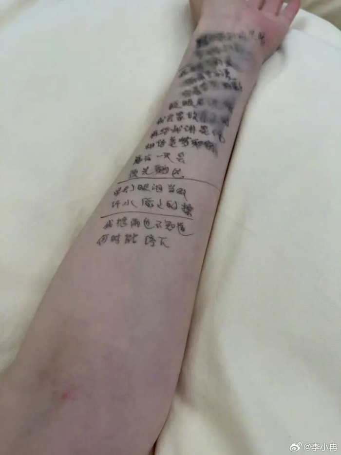 《乘风2026》二公小考,李小冉为了记住歌词,直接在左右手臂内侧抄满了整首歌的歌词,远看跟纹身似的。队友孙怡当场看懵,直接问:“你这胳膊纹身了?”