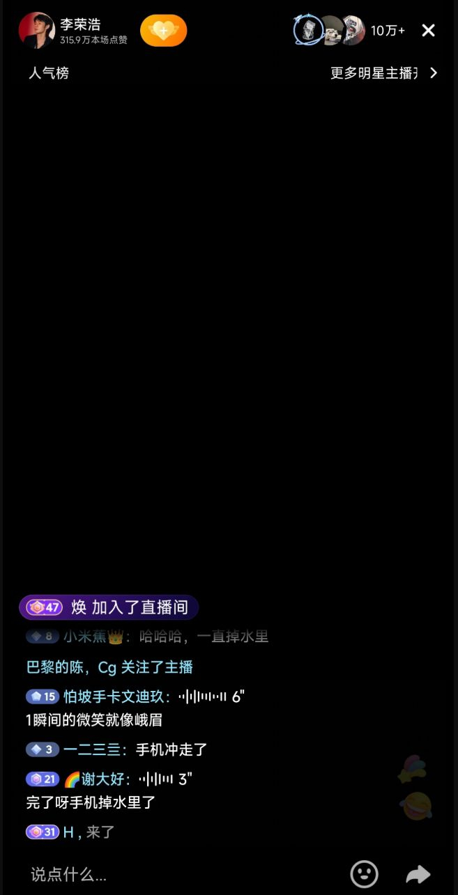 PChome 4月21日消息,歌手李荣浩在户外钓鱼直播时遭遇突发状况,手机不慎滑落水中,导致直播中断,超10万在线网友共同见证这一社死名场面。