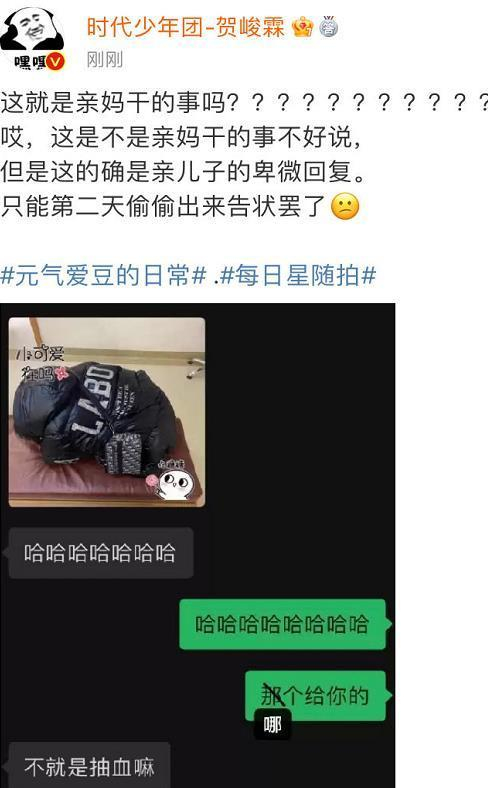 贺峻霖和妈妈的聊天方式很轻松,从小被妈妈“拿捏死死的”,长大后也很少怼过妈妈。去体检抽血由于有点害怕,缩在椅子上像一个“黑色团子”,没想到妈妈将他害怕的画面拍下来,还在他离开成都后,专门发给他,调侃抽血有什么害怕的呢?