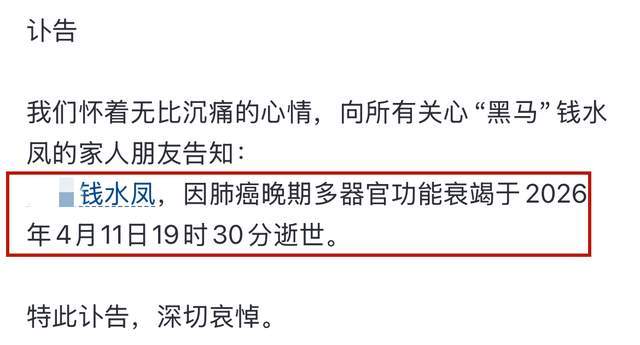 据钱水凤家人透露,她是在11号下午7点半离开的,原因则是肺癌晚期导致的多器官功能衰竭。