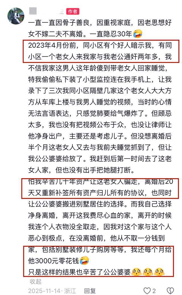 2023年4月份,她被同小区的好友暗示,老公再次疑似出轨。经过周密的策划后,钱水凤捉到了出轨的证据,最后选择离婚,但20天之后,她做出了改正,那就是自己净身出户,资产留给儿子。